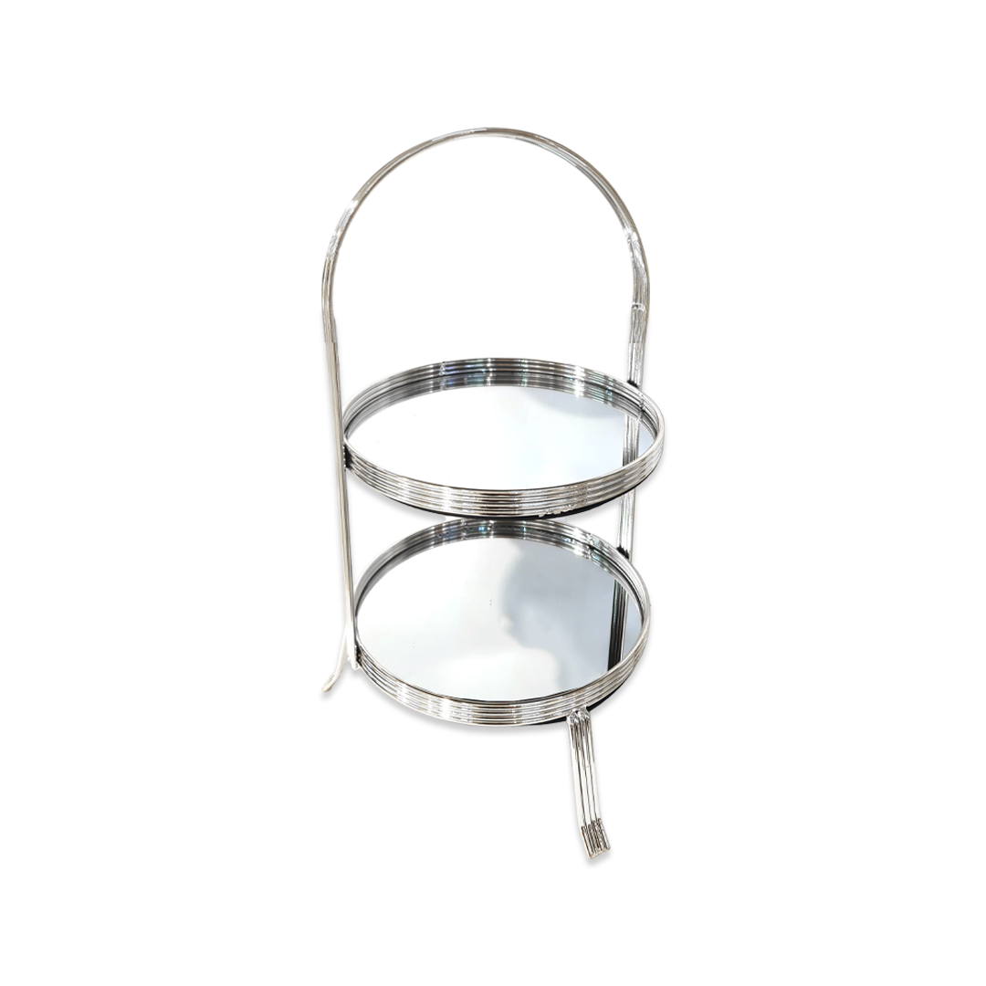 Features a round, 2-tier structure with a swirl-engraved metal frame in a refined silver finish.