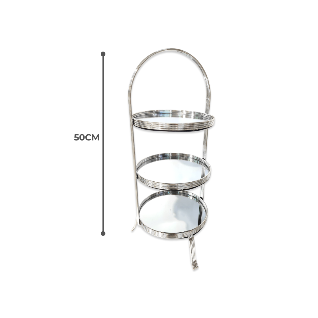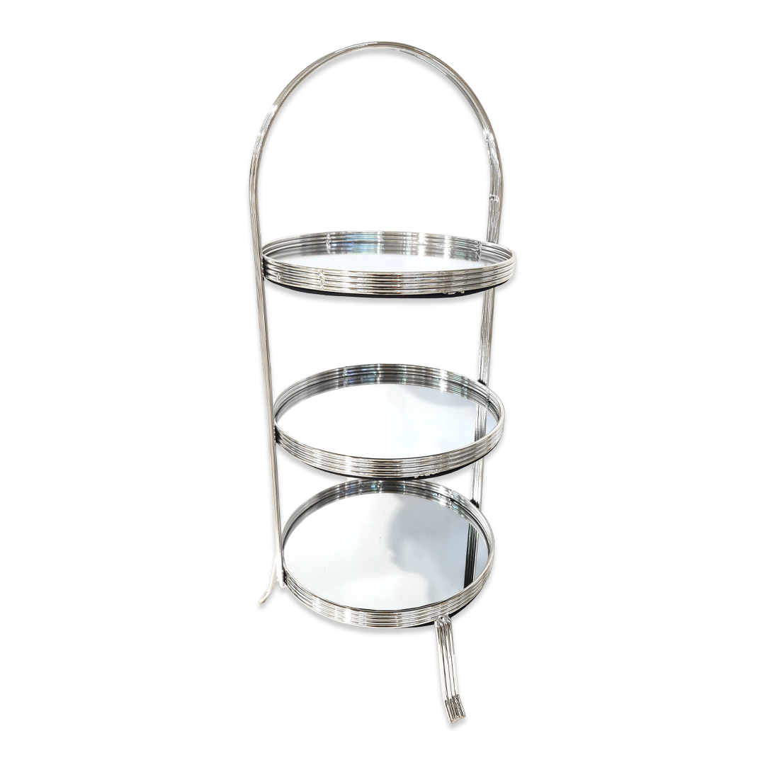 Features a round, 3-tier structure with a swirl-engraved metal frame in a refined silver finish.