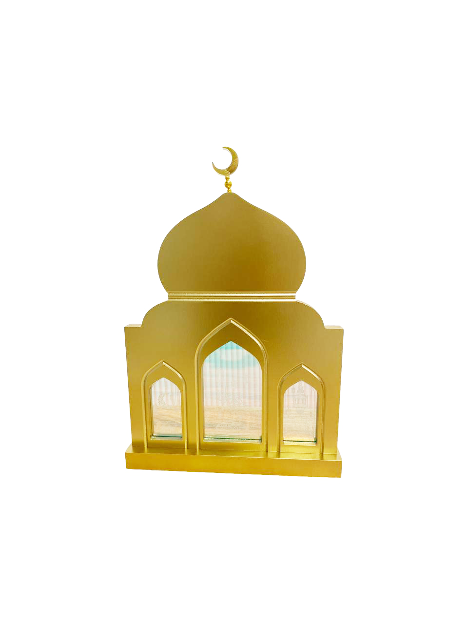 • Features a beautifully detailed gold-plated wood mosque, showcasing intricate Islamic architecture with domes, minarets, and arches for a truly elegant look.