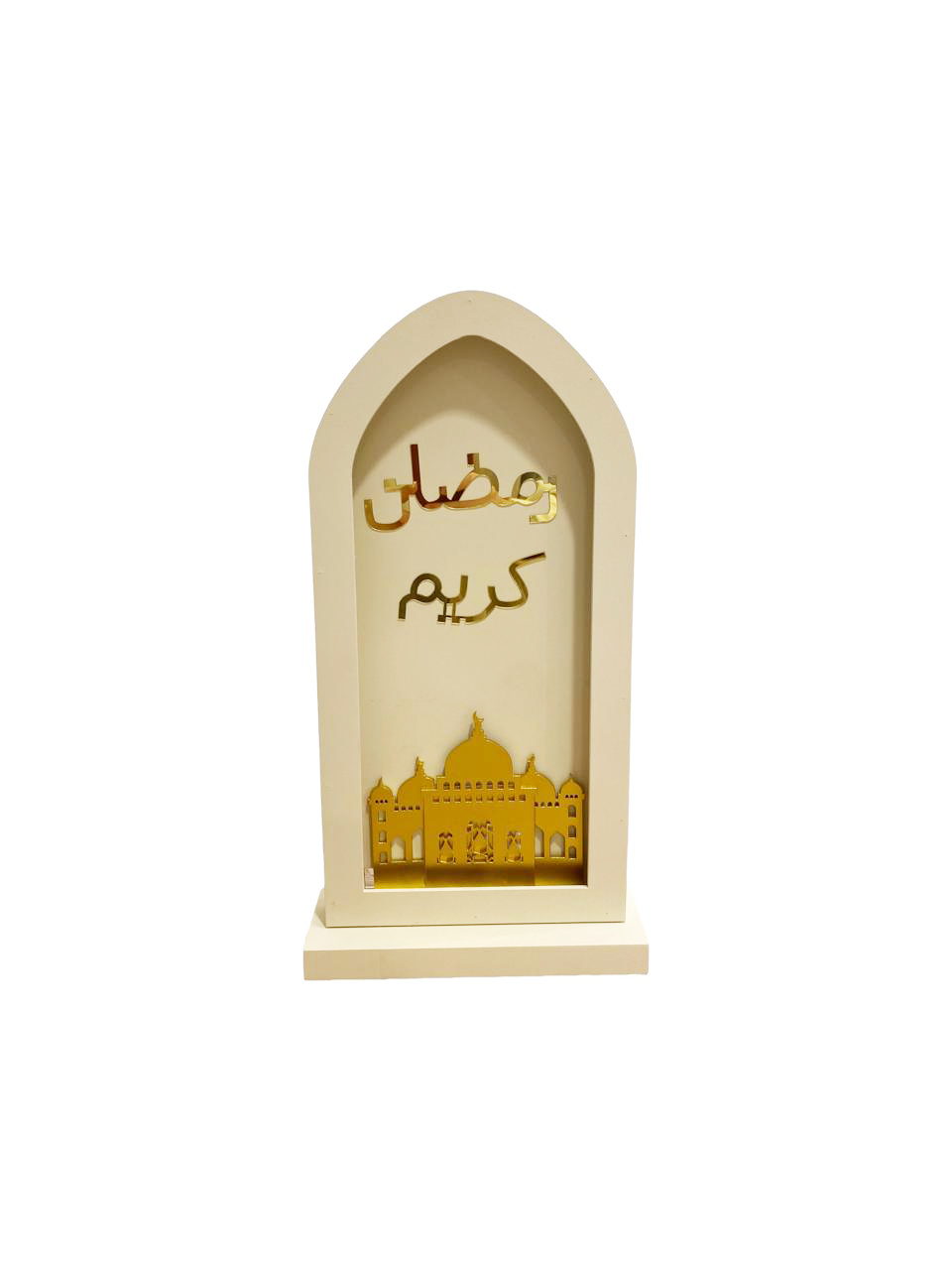 Off white and gold MDF Ramadan arch with a mosque and lights