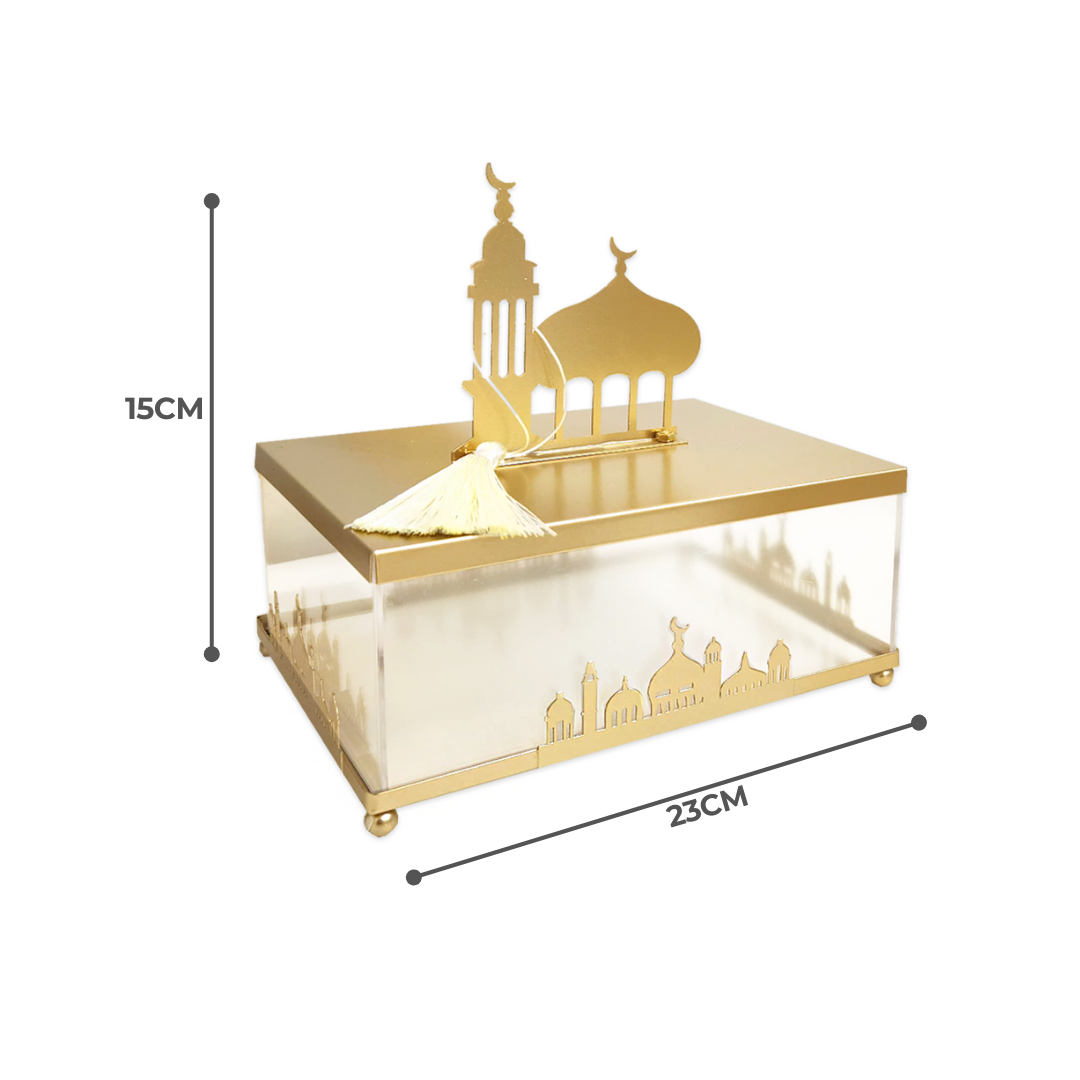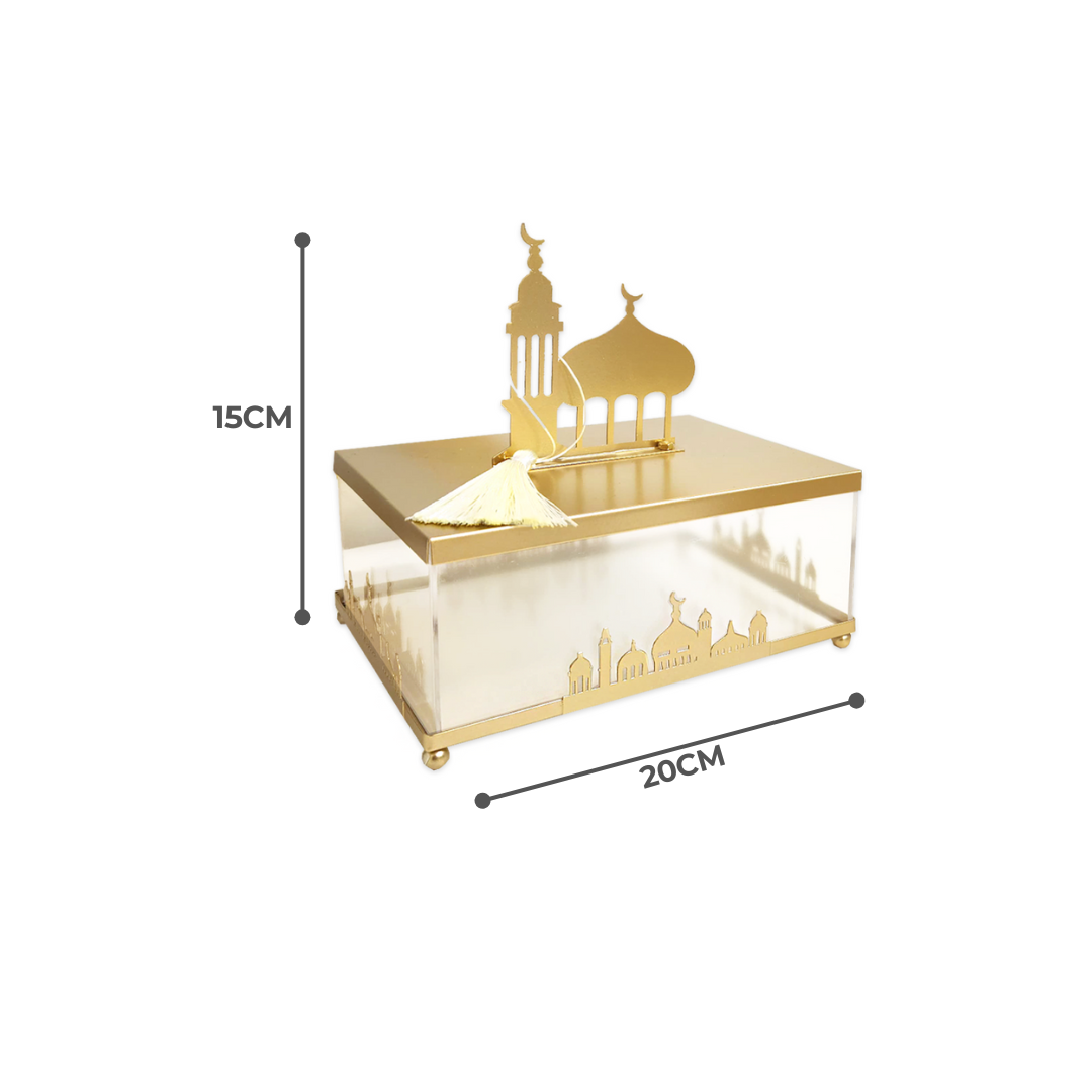 Features a Rectangular Plexi canister with a delicate gold metal mosque design, beautifully accented with a tassel for an added touch of grace and style.