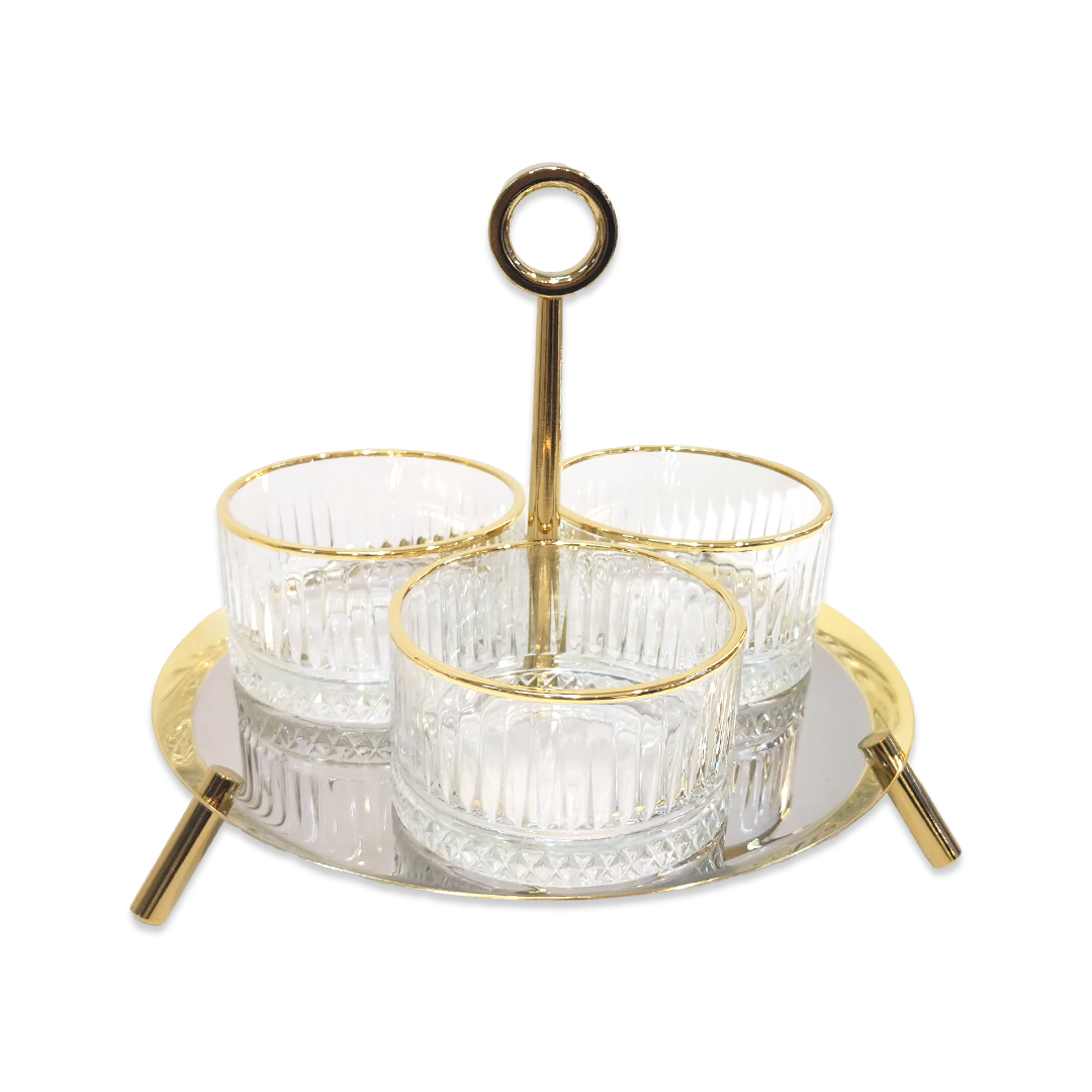 Includes a sleek rectangular gold tray paired with three matching stainless-steel bowls perfect for serving nuts, sweets, dried fruits, or condiments.