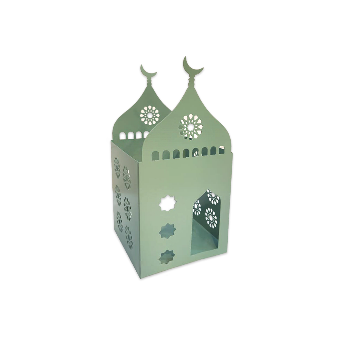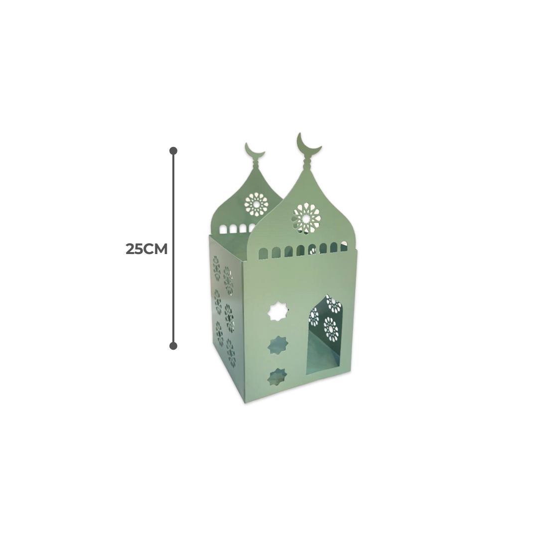 Features a beautifully detailed Sage-plated metal mosque, showcasing intricate Islamic architecture with domes, minarets, and arches for a truly elegant look.
